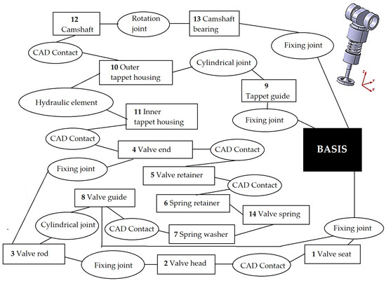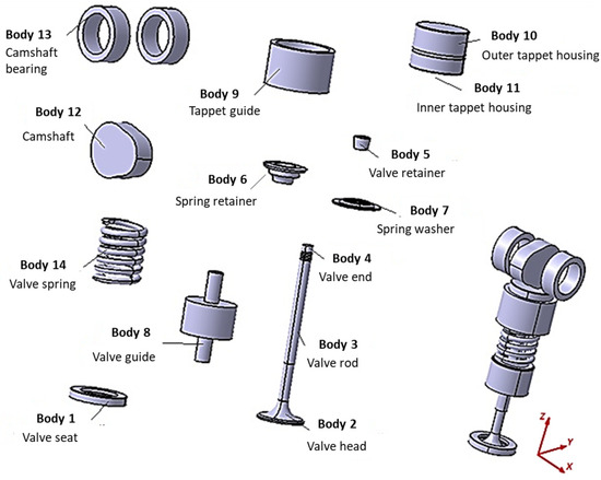 The virtual model of the direct drive valvetrain mechanism comprised 14 bodies of which 13 were modelled as rigid bodies and one, the valve spring, was modelled as a flexible body to take into account the mass of the coils, respectively the inertia forces determined by these, and the contact that may occur between the spirals (Figure 4).