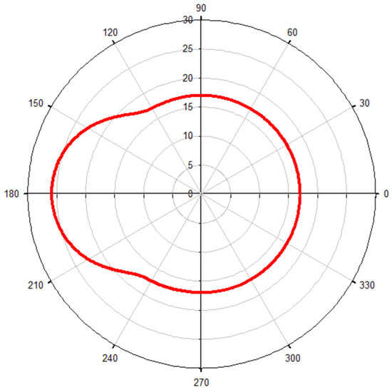 The realization of the 3D cam that determines the rotation of the valve can be done starting from the valve stroke measured experimentally on the test stand or by measuring the cam profile of the valvetrain shaft of the studied mechanism [33,34,35,36]. Thus, the diameter of the basic circle of the cam was measured (34 mm), the width of the cam was determined (12.5 mm) and the maximum height of the cam was measured (42.8 mm), and the lift height of the valve was 8.8 mm. Based on these data and the graph of the valve lift, the cam profile was determined (Figure 3). Thus, the existence of ramps can be observed at the beginning of the valve lift and at the end of its closing, which has the role of reducing shock loads and maintaining a constant speed so that the transition from the base circle to the cam attack area is smooth, both when the valve is opened and when it is closed. Additionally, in this area are taken the games and deviations from the cam profile resulting from wear or manufacturing defects [22].