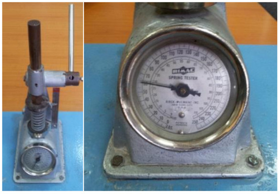 The elastic characteristic of the spring was determined using a spring test stand, Figure 7. The operation of the stand was based on the rotation of a crank through which a worm-driven gear was driven which caused the spring to act on a spring with a certain force corresponding to a weight whose value could be read on the graduated dial. Simultaneously, the value of the spring deformation corresponding to the applied weight could be read on the graduated ruler.