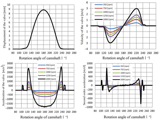 - Fujimoto, A.; Higashi, H.; Osawa, N.; Nakai, H.; Mizukami, T. Valve Jump Prediction Using Dynamic Simulation on Direct Acting Valve Train. Mitsubishi Mot. Tech. Rev. 2007, 19, 19–24. [Google Scholar]