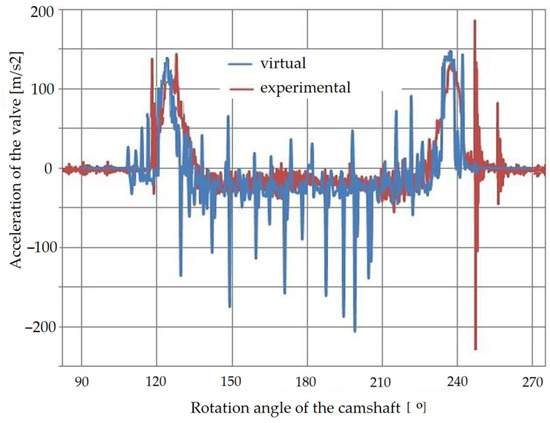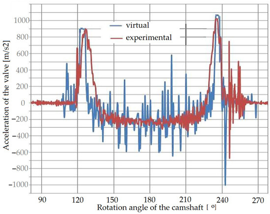 It can be seen in the kinematic analysis that the valve followed exactly the profile of the cam. This is because neither the forces in the system nor the inertia of the parts are taken into account in this analysis. The following behaviour is clear from the comparison of kinematic analysis with dynamic analysis at low operating speeds: the dynamic behaviour of the system remains unchanged, and at high speeds due to the influence of rigidity and body mass displacement, speed and acceleration have different values than those required, which is due to inertial forces and shock loads [45]. So, the dynamic behaviour of the components of the valvetrain system are more important at high speeds [40]. However, due to the way in which the contacts between the parts were modelled and due to the errors that may occur in determining the cam profile, small variations of the valve acceleration were obtained in the area of its maximum opening for the considered maximum camshaft speed. These variations can be seen more clearly when analysing the shocks in the valve.