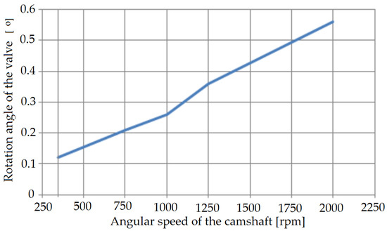 The results showed that in the case of changing the speed of the camshaft, an increase in the angle and the speed of rotation of the valve was obtained. As can be seen in Figure 15, the variation of the rotation angle is approximately linear. From the point of view of the rotational speed, it can be stated that with the increase of the speed of the camshaft, an increase is obtained, its variation being able to be approximated with a parabola (Figure 16).