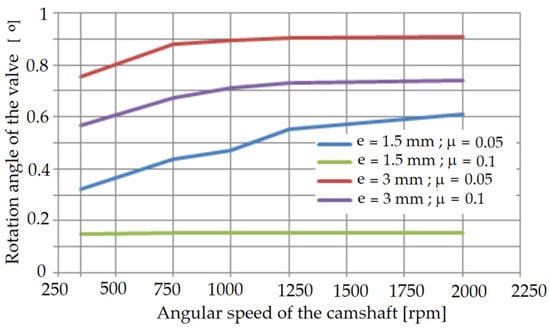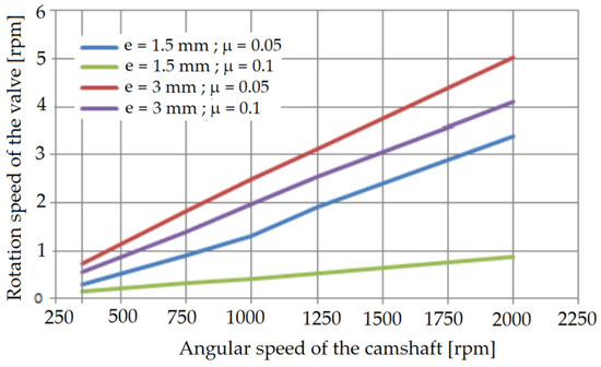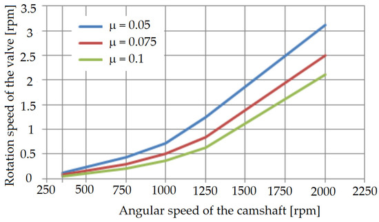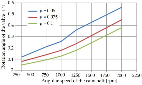 Therefore, it can be stated that a high value of the coefficient of friction, as a result of insufficient lubrication, causes a decrease in the rotational motion of the valve for all speeds of the camshaft.
