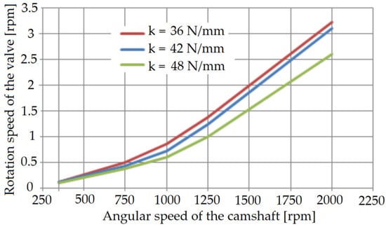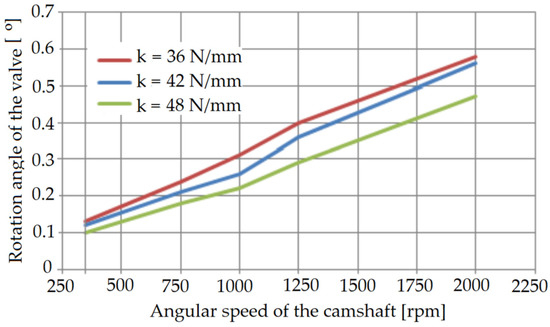 The influence of the valve spring on the rotation motion was simulated by modifying its rigidity. This was considered to be the initial stiffness of 42 N/mm and two other rigidities of 36 N/mm and 48 N/mm, corresponding to a softer, more rigid spring (Figure 21).