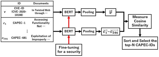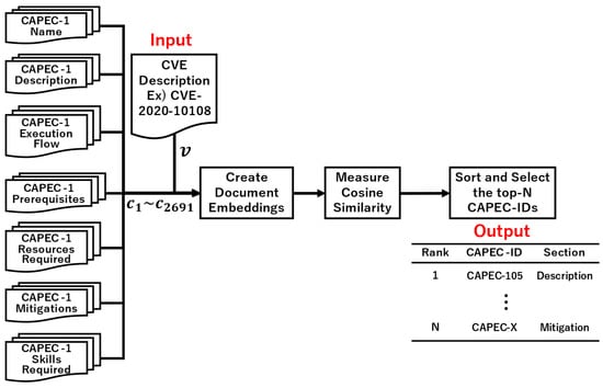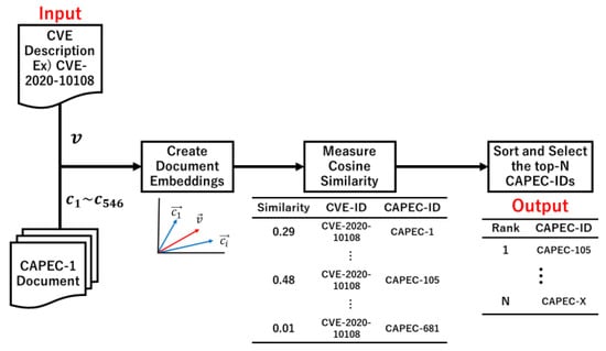 The proposed approach involves four steps. First, a corpus of CVE descriptions and 546 CAPEC-ID documents are generated. Figure 1, Figure 2 and Figure 3 show examples using CVE-2020-10108 as the input data. Second, a document embedding is created using a similarity algorithm. The document measure in Figure 1 created 547 vectors, while the section measure in Figure 2 and Figure 3 created 2692 vectors. Third, the CVE-ID vector and all CAPEC vectors are used to calculate the cosine similarity (Equation (1)). Finally, the CAPEC documents are sorted by the similarity score and N CAPEC-IDs are selected. Then, candidates for the associated CAPEC-IDs are obtained from CVE-IDs.