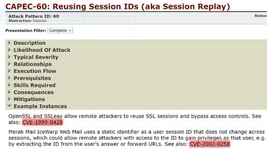 CAPEC has the Example Instance field. Figure 7 shows the Example Instance for CAPEC-60, where CVE-1999-0428 and CVE-2002-0258 are listed. This field has a total of 61 CVE-IDs. Although three are duplicates, they were recognized as different CVE-IDs in the experiment. The experiment assumed that the link from CVE to CAPEC was many-to-one and all 61 CVE-IDs were used. The experiment aimed to verify that the CVE-ID listed in the example instance field can be traced to the corresponding CAPEC-ID.