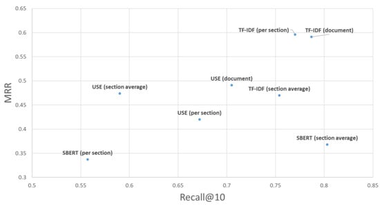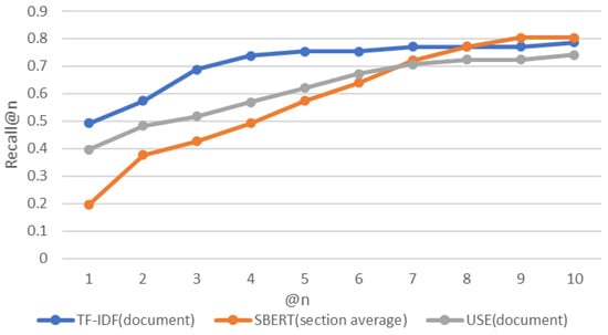 The first factor to find candidate attack patterns that may arise from vulnerabilities is not to miss associated attacks. The second is the ranking quality. Thus, the most important metric is recall followed by MRR. SBERT had the best recall, as 49 of the 61 CVE-IDs were successfully traced (Figure 11). Similarly, TF-IDF successfully traced 48 CVE-IDs, which is not a significant difference. In MRR, TF-IDF showed the best performance. Therefore, judging from the two evaluation indices comprehensively, TF-IDF is the most suitable. Below is a detailed analysis of TF-IDF and SBERT.