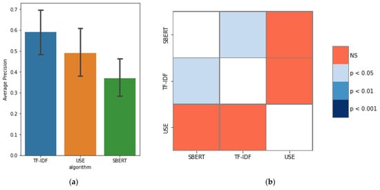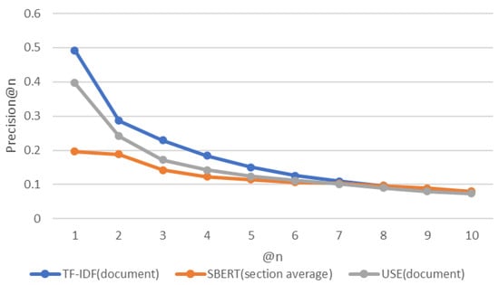 Table 2 shows that the “document” pattern is better suited for TF-IDF and USE. The “section average” pattern is most suitable for SBERT. Figure 11, Figure 12 and Figure 13 show the experimental results for these three patterns. Figure 14 shows a box-and-whisker diagram of average precision. All algorithms traced more than 70% of the CVE-IDs. The experiment involved only one ground truth because the link between CVE and CAPEC is a many-to-one link. This is the reason for the low precision. Changing the criteria of the ground truth impacts the value of precision. The number of words in the CVE description and CAPEC document are not correlated with the success rate of the proposed approach. A characteristic of CVE-IDs that failed was an insufficient CVE description. This is due to missing cybersecurity words important to trace or hidden fundamental weaknesses. Figure 15 shows the results of a Kruskal–Wallis test. The p-value less than 0.05 indicates a significant difference.