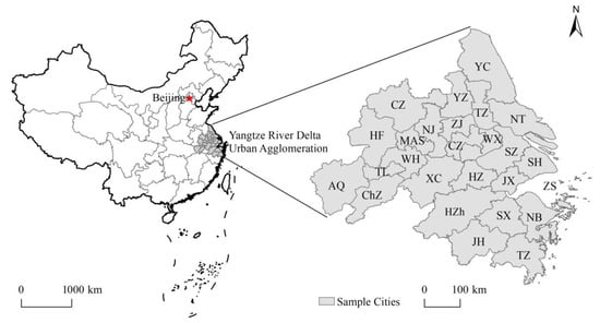 Location of the Yangtze River Delta Urban Agglomeration. Note: The location of the Yangtze River Delta Urban Agglomeration comprises the province-level administrations of Jiangsu, Zhejiang, Anhui, and Shanghai (Jiangsu Province includes the 9 cities of Nanjing (NJ), Yancheng (YC), Yangzhou (YZ), Taizhou (TZh), Nantong (NT), Zhenjiang (ZJ), Changzhou (Czh), Wuxi (WX), and Suzhou (SZh). Anhui Province includes the 8 cities of Hefei (HF), Chuzhou (ChZ), Ma’anshan (MAS), Wuhu (WH), Anqing (AQ), Tongling (TL), Chizhou (CZ), and Xuancheng (XC). Zhejiang Province includes the 8 cities of Hangzhou (HZ), Huzhou (HuZ), Jiaxing (JX), Zhoushan (ZS), Shaoxing (SX), Ningbo (NB), Taizhou (TZ), and Jinhua (JH)).
