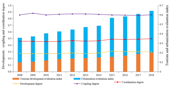 The mean values of tourism development and urbanization evaluation index, development degree, coupling degree, and coordination degree, according to the tourism and urbanization index of the Yangtze River Delta Urban Agglomeration from 2008 to 2018, are shown in Figure 2.