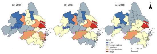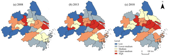 The spatial distribution of urbanization development in the Yangtze River Delta Urban Agglomeration is unbalanced, presenting a relatively stable spatial pattern (Figure 4). From 2008 to 2018, China’s urbanization process improved rapidly, and the level of urbanization significantly increased. In 2008, Shanghai and Nanjing were rated as high-level urbanization areas. In 2013, Suzhou, Wuxi, and Tongling rose from an upper-medium level to a high level, and Changzhou, Zhenjiang, Jiaxing, and Ningbo from a medium level to an upper-medium level.