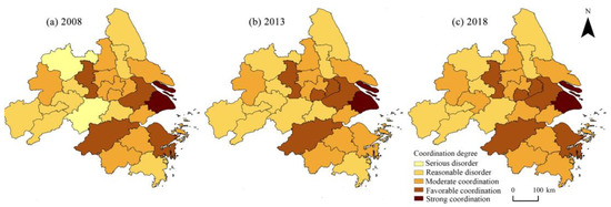 In 2008, Shanghai was in a strong coordinated state, and Suzhou, Ningbo, Hangzhou, and Nanjing were in favorable coordination. Ten cities, including Hefei, Wuxi, and Jiaxing, were in moderate coordination. Nine cities, including Anqing, Yancheng, and Taizhou, were in reasonable disorder, while the cities of Chuzhou and Xuancheng were in a state of serious disorder. In 2013, Shanghai remained in a strong state of coordination; Suzhou, Wuxi, Nanjing, and Hangzhou were in a favorable state; and ten cities, including Hefei, Changzhou, and Ningbo, were in a moderate state of coordination. Eleven cities, including Anqing, Yancheng, and Taizhou, were in a state of reasonable disorder, and Chuzhou and Xuancheng exhibited reasonable to serious disorder. So far, there are no cities demonstrating a state of serious disorder in the Yangtze River Delta Urban Agglomeration. In 2018, Shanghai was still in a strong coordinated state; Ningbo changed from moderate coordination to favorable coordination; and Suzhou, Wuxi, Nanjing, Ningbo, and Hangzhou were in a favorable state of coordination. Wuhu, Taizhou, and Huzhou revealed a state of reasonable disorder to moderate coordination, with eleven moderate coordination cities, eight reasonable disorder cities, and no serious disorder cities being found.