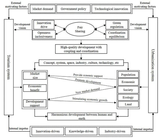 Urbanization has provided economic support for tourism, and the development of tourism has facilitated the promotion of urbanization. The huge domestic demand potential of urbanization has formed a new consumer market, providing broad market demands and an internal impetus for economic development. People demand a higher quality of life and consumption, becoming a new driving force for economic growth. Market demand, government policy, and technological innovation are external motivating factors for the coupling and coordinated high-quality development of tourism and urbanization in the Yangtze River Delta Urban Agglomeration. Market demand requires equilibrium in terms of supply: industrial structure reform is the core of this necessity in order to improve the industry chain level, make up the short board, and increase effective supply to meet the development of diversified demands. Innovation-driven, knowledge-driven, and industry-driven factors form the internal impetus to realize the coupling and coordination of high-quality development.