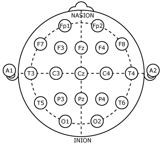 The implementation included using CHB-MIT Scalp EEG database [55,56], which contains EEG recordings with intractable seizures gathered at Children’s Hospital Boston. After the cessation of anti-seizure medication, subjects were observed for up to several days to define their seizures and determine their suitability for surgical intervention. These recordings were made using the International 10–20 method of EEG electrode physical locations and names, as shown in Figure 2. In this method, the electrode’s name points to its placement on the brain; C refers to the center of the head, F: to the front, T is temporary, P is a rear part, and O means occipital. In addition, the name also contains a number that refers to the side of the cerebral; for the right side, even numbers are used, and odd numbers are used on the left [57,58].