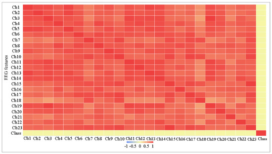 Figure 3. The Correlation matrix among all features of CHB-MIT dataset. - High correlation between most of the features, as can be seen in Table 2 and Figure 3, the average correlation between each feature and other features is shown in Table 2 in columns (correlation A), and most values are more than 0.8. The features are not completely matched (i.e., the correlation is not 1) to be considered as a frequent feature and will be removed.