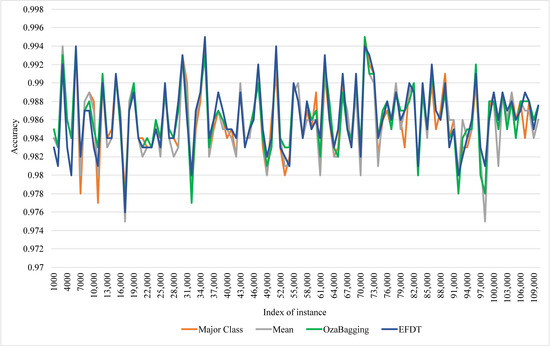 - Hulten, G.; Spencer, L.; Domingos, P. Mining time-changing data streams. In Proceedings of the Seventh ACM SIGKDD International Conference on Knowledge Discovery and Data Mining, San Francisco, CA, USA, 26–29 August 2001; pp. 97–106. [Google Scholar]