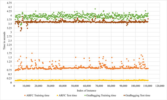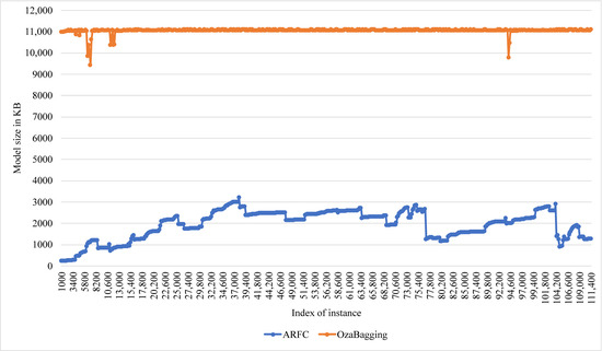 In online bagging, any new data sample is selected according to the Poisson(1) distribution. The classification decision of the ensemble bagging model is based on voting for all K base classifiers with the same weight. It assigns an initial weight w = 1 to each new data example and then passes it to the first weak learner. If this data example is misclassified, its weight will increase before passing it to the next weak learner. The base learner in the proposed model is a VFDT classifier, and the ensemble size used is 10 learners. The ARF classifier is presented in [54]; it uses the resampling method of Online Bagging with a different adaptive method. The parameters of ARF can be categorized into two groups, the first one related to the bagging model and the second related to the base learner. The first group includes: