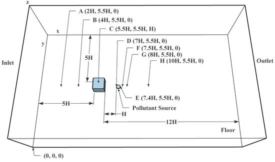 The Reynolds number is kept constant at 4.03 × 106, based on the height of the cube and the free stream velocity. The specified flow field at the inlet of the computational domain is in the form of a logarithmic profile with the no-slip condition at the ground. A passive source of pollutants is located on the floor of the computational domain at a distance H from the rear surface of the building, using as a pollutant methane (CH4) gas with a concentration and release of 600 ppm and 18.5 L/h, respectively. The dimensionless concentration coefficient K of the passive pollutant is defined as [48,49]: