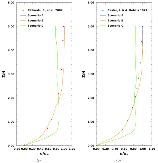 The air flow field around the cubical geometry is presented in Figure 9 using normalized velocity profiles on the symmetry plane at different streamwise positions upstream, downstream, and at the middle of the roof of the cube (X/H = 5.5) for all three scenarios [44,54,61,62,63,64,65]. Comparisons are also made with Richards and Castro’s experimental data [60] for Scenario A.