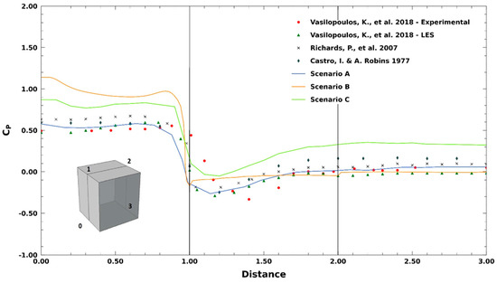 Pressure coefficient distribution at the building’s symmetry plane for Scenarios A−C [4,44,54].