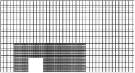Figure 5 shows the grid arrangement used in the simulations. The root computational grid (coarse grid) is shown at full height of the computational domain in contrast with the nested (finer grid-darker parts), which is shown at two building heights.