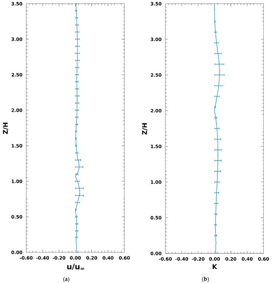 Figure 6a presents the profile of the error bars of the normalized velocity, at the axial position 0.5 H from the rear surface of the building for scenario A. Additionally, Figure 6b shows the profile of the normalized concentration of the pollutant at the same axial position and scenario.