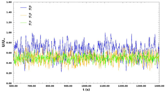 Every simulation is carried out until flow stationarity has been achieved. Figure 7 presents the normalized velocity components with respect to the free-stream velocity (ux/u∞, uy/u∞, uz/u∞), at the point with Cartesian coordinates of X: 10 H, Y: 5.5 H, and Z: 0.5 H and for the period from 600 to 1400 s for Scenario A.