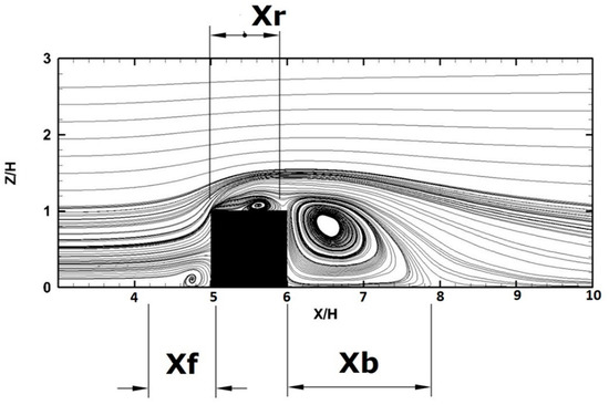 Different recirculation lengths Xf, Xb, and Xr are defined for the frontal, rear, and roof recirculation of the building, respectively.