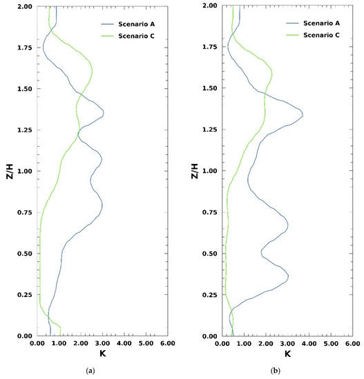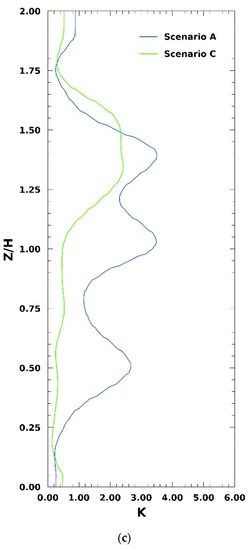 As described in Figure 4, the turbulent kinetic energy distribution at the inlet of the computational domain is almost identical for Scenarios A and B and different from Scenario C because of the effect of the buoyancy forces from the microclimate conditions.