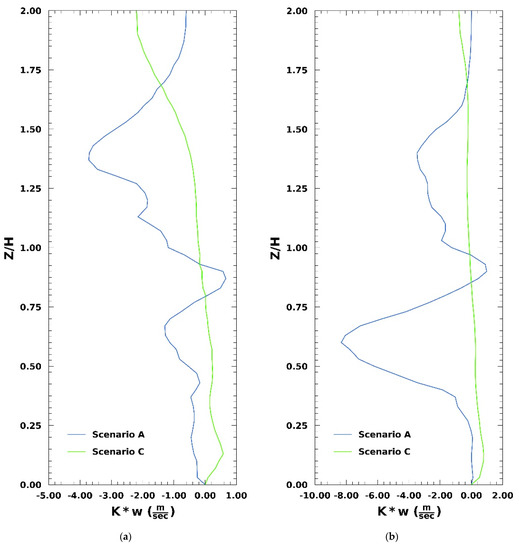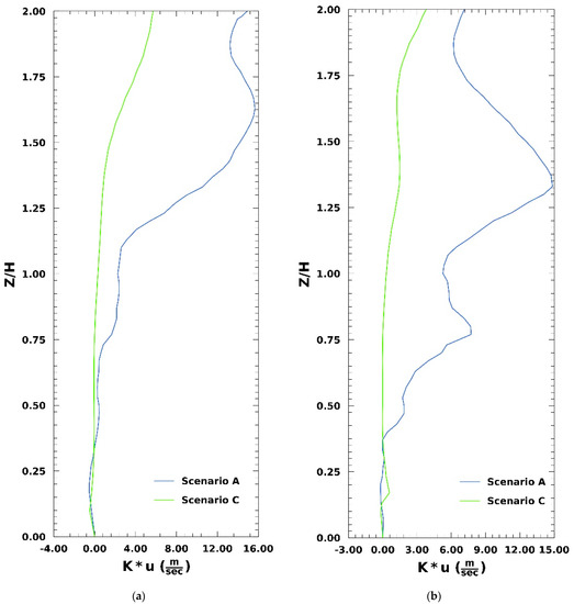 As observed in Figure 2a, an important deviation appears in Scenario C that corresponds to the application of the meteorological model in comparison with the other two scenarios. This difference appears also in the free-stream flow region and is caused by the strong buoyancy effects caused by the increased thermal heating of the air.