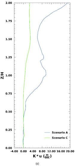 Figure 14 present the distribution of the flux concentration on the symmetry plane because of the x-velocity component for Scenarios A and C at the x-positions: (a) (X: 7 H, Y: 5.5 H), (b) (X: 7.2 H, Y: 5.5 H), and (c) (X: 7.4 H, Y: 5.5 H) for heights Z that extend from 0 to 2 H.