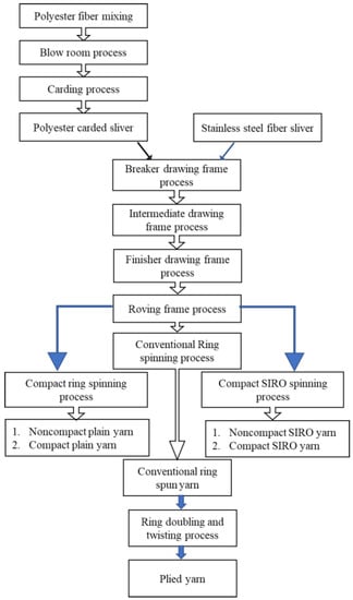 The polyester fibres were processed in the blow room (Toyota-Ohara-Hergeth) and carding (Howa-CM80) to produce the carded sliver. The blending of polyester and stainless-steel fibre slivers was carried out on the draw frame (Toyoda DHY 500C). To assure the uniform mixing of heterogeneous fibres, three recurrent blending passages were given on the draw frame. The slivers were then processed on a simplex frame (Toyota FL16) to produce the roving. Roving made of 80% polyester and 20% stainless steel was then used to produce the yarns. The process flow chart of the numerous yarns produced is shown in Figure 1.