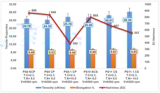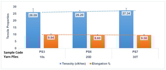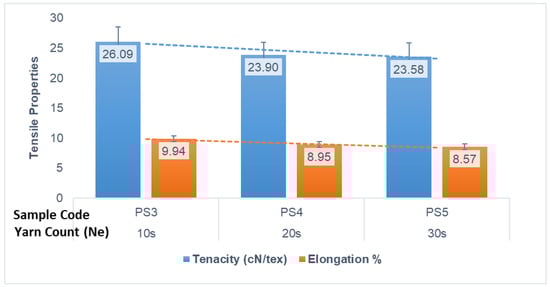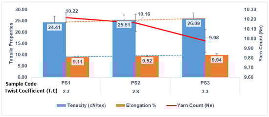 The tensile properties of MFHSYs produced at different yarn counts are shown in Figure 3, where PS3, PS4 and PS5 represent yarn counts Ne 10 s, Ne 20 s and Ne 30 s, respectively. Whereby the Ne 10 s represents a coarser yarn count while Ne 30s indicates a relatively finer yarn count. All three yarn counts were produced at a fixed level of TC, i.e., 3.3 to keep an identical angle of twist in the yarn [44]. The decrease in tenacity and elongation with a stepwise increase in yarn count can be assigned to the decrease in the total number of fibres constituting the yarn [45]. Since SSSF is about six times heavier (8.0 g·cm−3) than that of polyester fibre (1.34 g·cm−3), which means that one low tenacity SSSF fibre (19 cN tex−1) with minor elongation (1.0%) can replace about three high tenacity polyester fibres (46 cN tex−1) with superior elongation (32%) in the yarn. In addition, the total number of fibres in the yarn cross-section also tend to reduce with increasing yarn fineness (greater value of Ne yarn count) [46,47]. As a result, in a finer yarn with an overall smaller number of fibres in the yarn cross-section, the replacement of polyester fibres by SSSF will reduce the yarn strength and elongation. While in coarser yarn count, due to higher frictional coefficient o SSSF and a greater number of total fibres in the yarn cross-section, a stronger inter-fibre cohesion evolves in the yarn [48]. Thereby, for coarse yarns the resistance to slippage among the fibres in the yarn is increased under a tensile load producing a stronger yarn with higher elongation [49]. However, at a higher yarn count, the contribution of TC towards tensile properties of yarn has appeared to decrease with a stepwise increase in yarn count. Hence, at a higher yarn count, a further increase in TC beyond 3.3 can try to achieve even better tensile characteristics of the yarn.