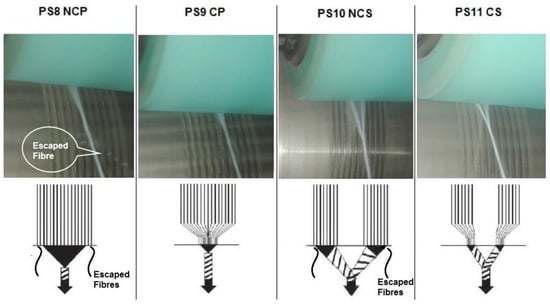 The results of the tensile properties of noncompact plain (NCP), compact plain (CP), noncompact SIRO (NCS) and compact SIRO (CS) yarns are presented in Figure 5. It was surprising to observe that the NCP yarn showed unexpectedly higher tenacity than that of CP yarn produced even at the same machine and operating parameters. During the processing of NCP yarn on a K-44 machine with pneumatic compaction inactive, the edge fibres are not fully integrated into the yarn body, and some fibres may escape the twisting effect due to the wider width of drafted roving and consequently outflowing the spinning triangle. These escaped fibres are either wasted as a fly or attached disorderly in the yarn, as exposed in Figure 6, under PS8 NCP.