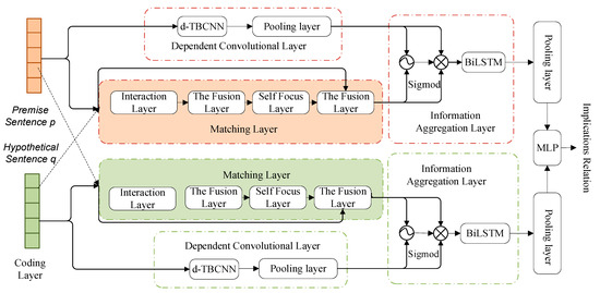 - Matching layer and dependency convolution layer: they mainly complete the extraction of local inference information between sentences and syntactic structure inference information. Moreover, by extracting the interactive information between sentences, implicit logic is introduced into the reasoning process to improve the interpretability of the reasoning process.