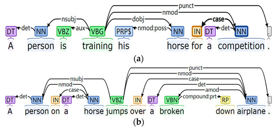 - De Marneffe, M.-C.; MacCartney, B.; Manning, C.D. Generating typed dependency parses from phrase structure parses. In Proceedings of the Fifth International Conference on Language Resources and Evaluation, LREC 2006, Genoa, Italy, 22–28 May 2006; pp. 449–454. [Google Scholar]