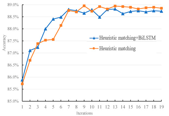 Figure 6 shows the learning curve of the SFC-DMN model with the heuristic matching method and SCF-DMN model with BiLSTM network and heuristic matching method on the SNLI dataset. The figure shows that the learning curve of the SCF-DMN model with the heuristic matching method tends to stabilize faster. As a result, the final stable state’s accuracy of the former model is higher than that of the latter.