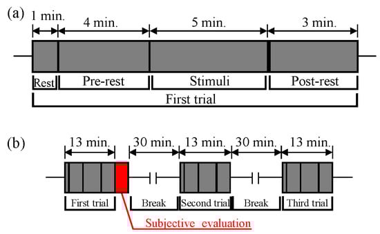 Eight healthy males with normal hearing in their twenties were selected as the subjects of the experiment. It should be noted that in this research the relationship between the subjective and biological response on sound representation was assessed. So, the subjects were university students in their twenties. However, it should also be noted that, ideally, subjects should be selected from a large population of various ages, if one wants to determine the effect of the subjects’ age on their interpretations. The method of the experiment is shown in Figure 1. After a one-minute period in which the subjects familiarized themselves with the experimental environment, they had a four-minute pre-resting period, listened to a five-minute-long auditory stimulus, and then had a three-minute post-resting period, for a total of 12 min. After completing the experiment, a subjective evaluation of the subjects’ impressions of the presented sounds was conducted. To verify the reproducibility of this experiment, the experiments were repeated three times under the same experimental conditions as shown in Figure 1b. To prevent the disturbance of brain waves and heart rates caused by visual stimuli as much as possible, the experiment was conducted in a dark room, shown in Figure 2a. In addition, to avoid artifacts such as muscle potential and eye movement, each subject was instructed to relax in a seated position with their eyes closed during the experiment. To prevent fatigue, all three experiments were conducted with a 30 min break between each trial.