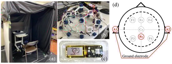 (a) Experimental environment inside the dark room, (b) adopted EEG headset (OpenBCI, Ultracortex Mark IV), (c) heart rate monitor (AffordSENS Corporation, Vitalgram), and (d) electrode arrangement points.