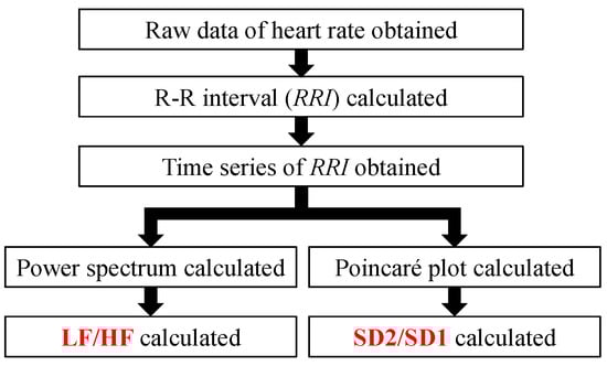 Secondly, the HRV indices were analyzed by following the method indicated in Figure 3. First, the time intervals between each of the R-waves among each of the P, Q, R, S, T and U waves [] were analyzed as a time series of the R-R interval (RRI) [] from the waveform of the heart rate. Second, two kinds of heart rate indices of LF/HF and SD2/SD1 were adopted. LF/HF is an index for estimating sympathetic and parasympathetic activities [] from the power spectrum of the RRI, while SD2/SD1 represents the RRI fluctuation that can be estimated based on the Poincaré plot [], which is a geometric representation of the time series of RRIs.