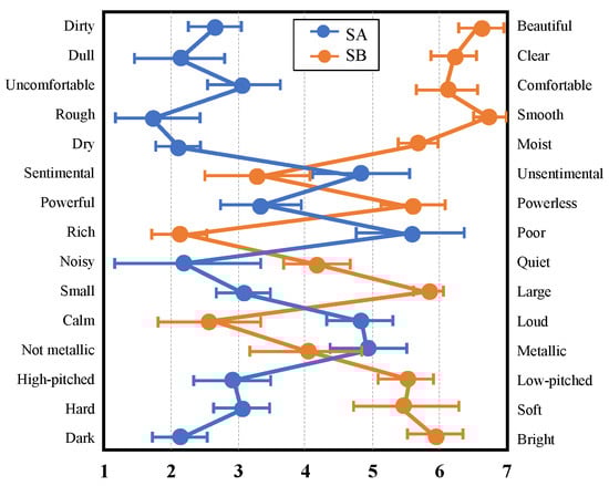 Results of the profile analysis of the subjective evaluation experiment. All the results for each of the subjects were arithmetically averaged and as a profile. The blue dots are the results for SA, while the orange dots are those for SB. There is a large difference between these two sounds with significant differences for all items (p < 0.05).
