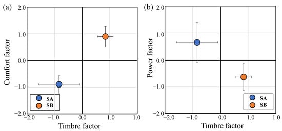 Figure 7a,b show the averaged factor scores and their SDs of the comfort and timbre factors (Figure 7a) and the power and timbre factors (Figure 7b), respectively. From these results, SB indicated a contrasting impression compared to SA, and was rated as a sound with a higher comfort score and lower timbre and power scores. Based on the above results, it can be suggested that white noise and murmuring river sounds can be separately perceived as uncomfortable and comfortable sounds, respectively, for the majority of people.
