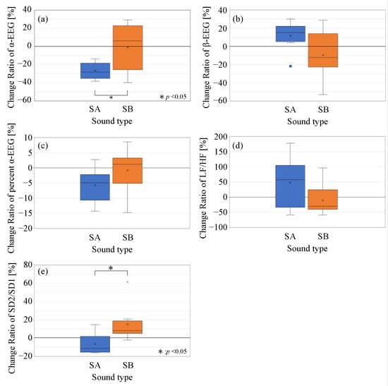 The change rates of α-EEG, β- EEG, percent α-EEG, LF/HF, and SD2/SD1 are shown in Figure 8a–e, respectively. Note that, in this section, the biological data obtained from all three trials in Figure 1b are averaged and discussed. The change rates of α-EEG showed a significant difference between SA and SB (p < 0.05). This indicates that the α-EEG significantly decreased when SA was presented, while the α-EEG did not significantly increase when SB was presented. This is consistent with past research [], where the brain wave in the alpha domain was also decreased by exposure to white noise. In some references, such as [], the strength of α-waves was proportional to the degree of relaxation of the subject. However, in this study, the averaged result of α-EEG was not increased by the murmuring river sound. The reason for the unchanged α-EEG will be discussed in the next section. In the case of change rates of β-EEG and percent α-EEG, there was no significant difference between those in the SA and SB conditions. The presence of stress has been shown to increase the β-EEG [], but in this case, it is considered that the environmental stress on humans caused by the white noise and murmuring river sound did not have different influences on human, while the α-EEG slightly increased in the SA condition. It is said that components in the beta frequency band are distributed in the front of the head [], and the amount of frontal beta is correlated to task difficulty. The reason for the lack of a significant difference may be due to the fact that the stimulus was not a task involving difficult judgements, but rather just exposure to sounds. Moreover, in the literature [], no significant differences have been observed between conditions with and without acoustic stimuli. However, the results of the present study had a greater standard deviation, especially under the SB condition, indicating large inter-individuality. This may be caused by inter-individual differences in the perception of the sound of a murmuring river.