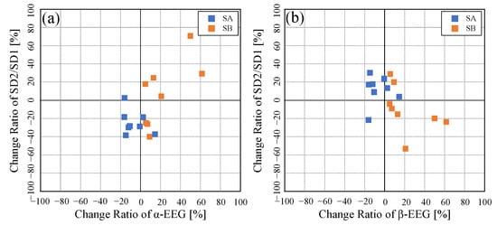Relationship between (a) α-EEG and SD2/SD1 and (b) β-EEG and SD2/SD1, respectively.
