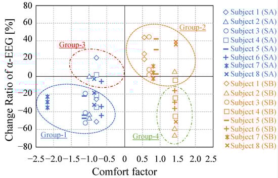 A non-hierarchical cluster analysis using the k-means method was conducted using the factor scores and the change rate of α-EEG, and the relationships among them were discussed for each cluster. The data used for the analysis consisted of two types of sound sources and three experiments with eight subjects, for a total of 48 datasets that were classified into four groups. The results of the cluster analysis are shown in Figure 10. The orange plots show the results when SB was presented, while the blue plots show those when SA was presented. Each marker indicates individual subjects. It should be noted that, in this figure, the subjective data were obtained only once for the three biological data. The results of the analysis were classified into the following four groups: Group-1, whose α-EEG decreased when presented with white noise; Group-2, whose α-EEG increased when presented with the murmuring river sound; Group-3, whose α-EEG did not change or increase when presented with white noise; and Group-4, whose α-EEG decreased when presented with the murmuring river sound. The differences among these groups were examined using the time trends of the change rate of α-EEG. The examples of the results measured during the three different trials for one subject marked by blue and orange circles in Groups-1 and 2 are shown in Figure 11a,b, respectively. These figures show that the α-EEG of the subject decreased by 4 to 9 min after the presentation of white noise (Figure 11a), while that in Group-2 increased by 4 to 9 min after the presentation of the murmuring river sound (Figure 11b).