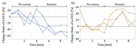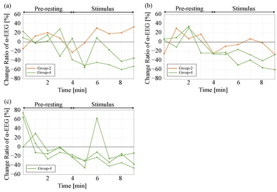 Examples of the time-transient change rate of α-EEG of (a) one subject indicated by orange triangles (Subject 2, Figure 9) categorized into both Group-2 and -4 with murmuring river sound, (b) another subject indicated by orange squares (Subject 4, Figure 9) categorized into both Group-2 and -4 with murmuring river sound and (c) another subject indicated by orange plus signs (Subject 6, Figure 9) categorized into only Group-4 with murmuring river sound, respectively. Note that in these figures the three trials in the experiment are indicated as three lines. In the case of subject in (c), all three lines indicate decreased α-EEG, while in the cases of (a,b), one line indicates increased α-EEG compared to the other two lines, indicating decreased α-EEG.