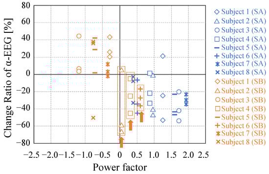 Relationship between the change ratio of α-EEG and the factor scores of power. Each marker indicates the same subjects as those in Figure 9. Each odatum includes two types of sound sources (SA and SB) and three experiments with eight subjects. Blue plots indicate scores for SA (white noise), while orange plots indicate scores for SB (murmuring river sound).