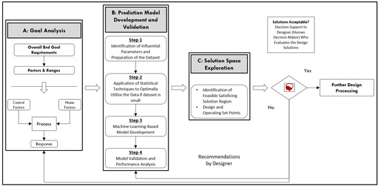 As mentioned earlier, the aim of this work is to develop an inverse goal-oriented method that is independent of the forward flow. The method implemented in this work does not need to establish a forward flow of information in the PSPP chain. It can lead the designer directly from the requirements to the identification of the process parameters in an inverse direction. The information flow for this goal-oriented method will be elaborated on, as depicted in Figure 5. The flow of information starts with end product goals desired for the product and process. The preceding stages are explored to identify solution set points that satisfy the end goals. All steps for the method are explained below.