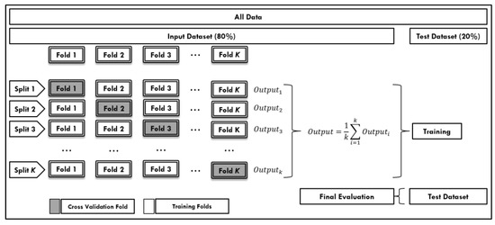 As the number of data points in the datasets for each space of the hot stamping was small, we divided the datasets into an input dataset and test dataset. Initially, 80% of the data points in the overall dataset were allocated to the input dataset for training the model, while 20% were allocated to the test dataset. We exploited statistical techniques to optimally utilize limited data. We utilized the k-fold cross-validation (k-fold CV) technique, which has proven to be very useful for small datasets [56]. k-fold CV provides the opportunity for each data point in the input dataset to be used for cross-validation at least one time and for training k one time [56], as shown in Figure 3.
