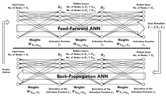 Network topology and random initialization both significantly influence the performance of the ANN. To incorporate the effect of both network topology and random weights in our model, the number of neurons in hidden layers was made to keep swapping among different numbers ( 1 , 2 , 3 , .   n ) . Hence, for two hidden layers, swapping the number of neurons among n numbers gave rise to a total of c = n × n combinations, as shown in Table 3. All these c combinations of network topologies were trained on k sets of training and CV datasets generated through k-fold CV, resulting in c × k ANN models. Each of these models was initialized with different random weight initialization methods ( 1 , 2 , 3 , .   w ) . The random initialization methods used are shown in Table 2. Finally, we have N = c × k × w models that were trained on the input dataset. The number of iterations was different because each step has a different number of input and output parameters, and for each step, a specific number of iterations was determined when the CV error was at a minimum to avoid overfitting of the model. A generalized schematic of the ANN has been given as Figure 4.
